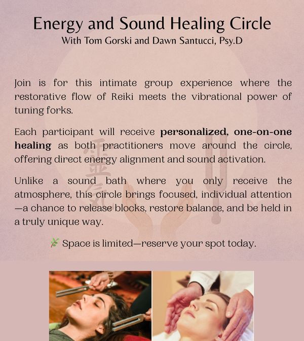 In this circle, each participant will receive both Reiki Energy Healing and a mini Tuning Fork session, offering a powerful blend of gentle energy work and vibrational therapy.